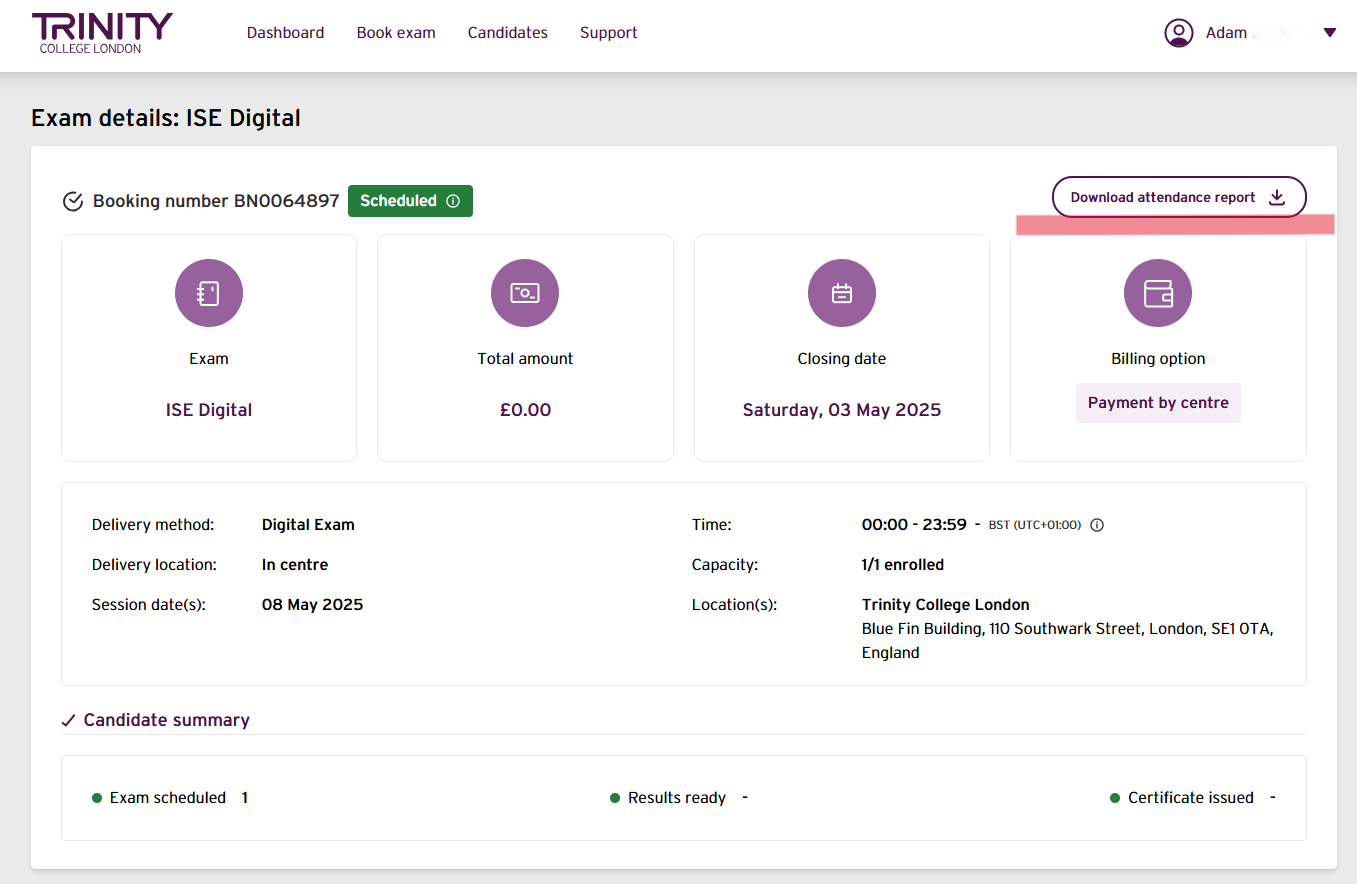 1. Download the attendance report from the MyTrinity exam booking (underlined in red below).