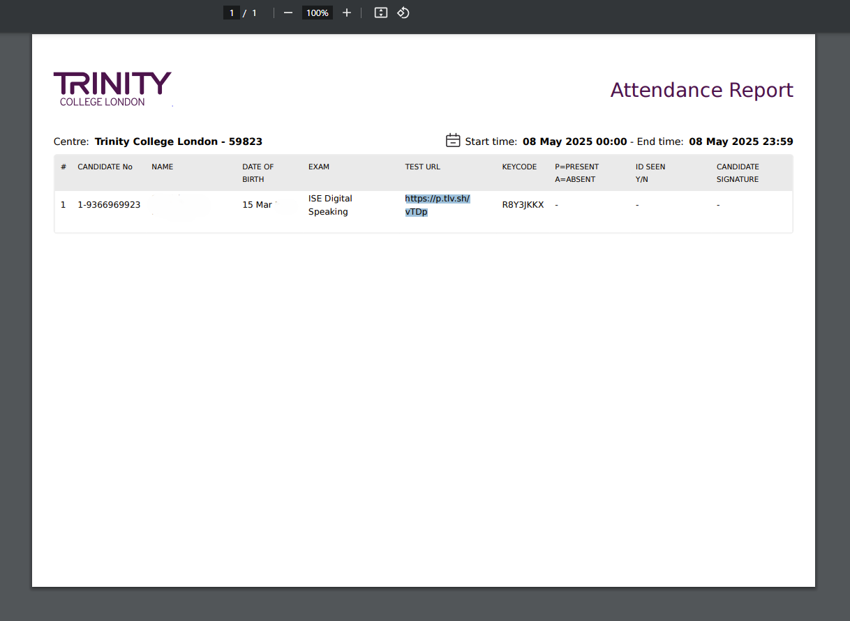 - Tip: Once downloaded, cut out the individual rows of the attendance report and place each candidate's information on their assigned table. The attendance report includes both the candidate's individual exam URL and the keycode that will be required by the candidate to start the exam.