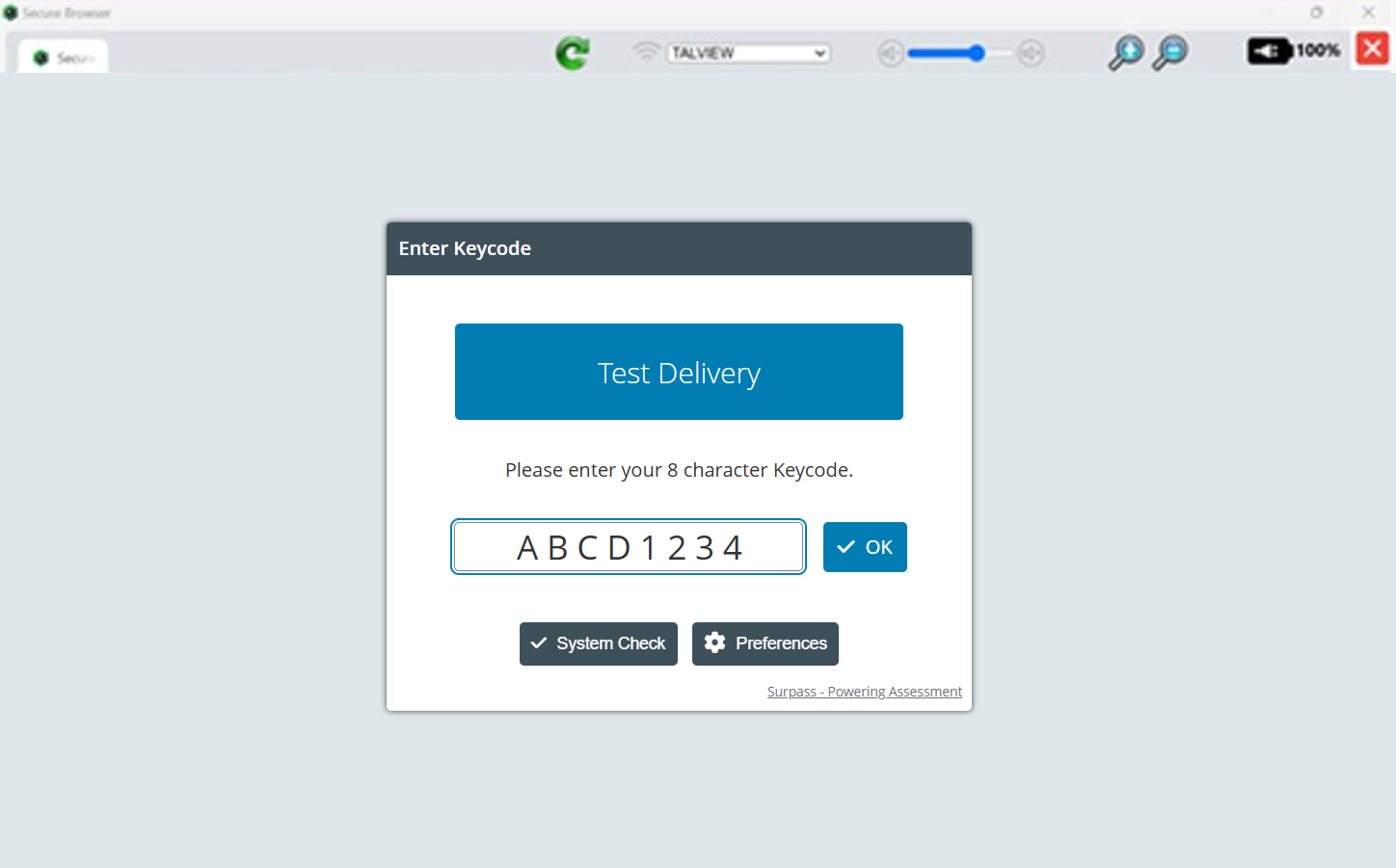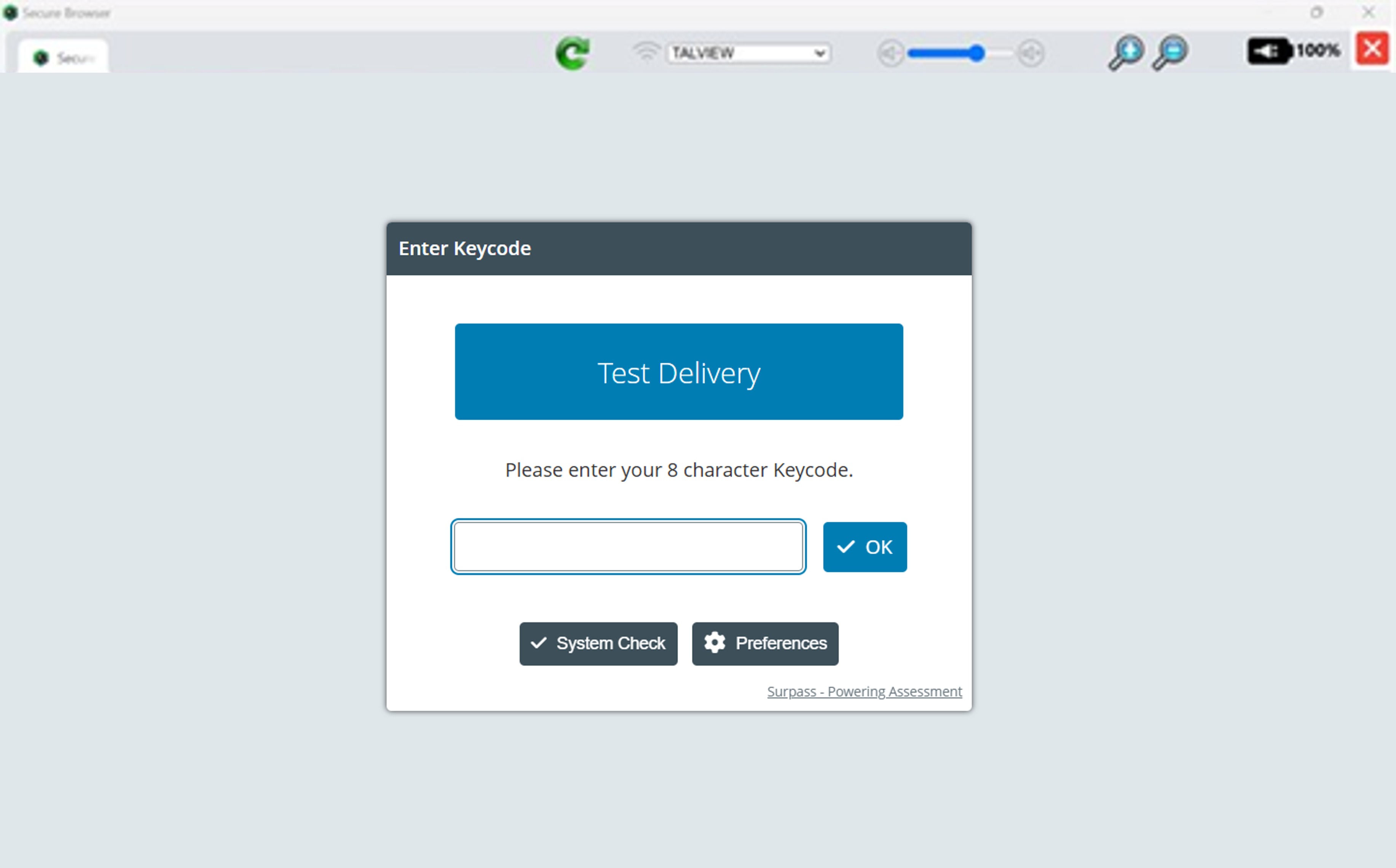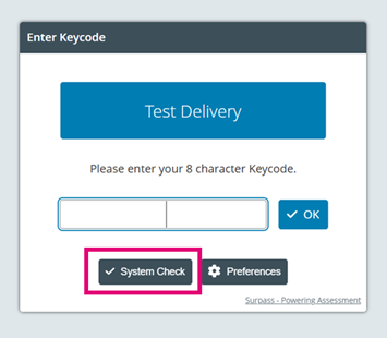 To initiate the system check, candidates need to click on the button “System Check” on the bottom left of the keycode entry field.