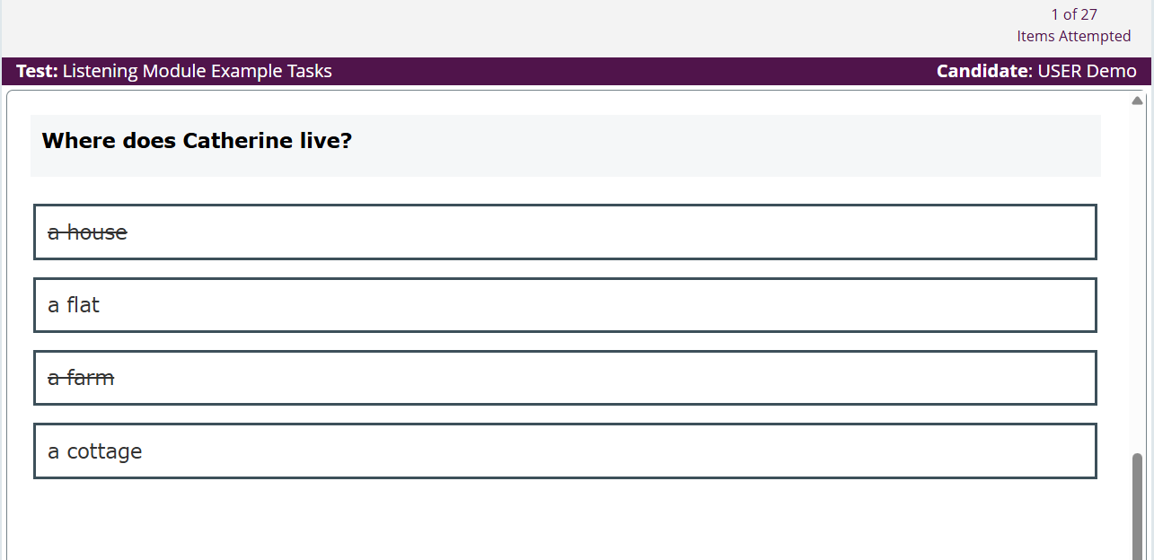 - Answer elimination: By right-clicking, candidates can cross out answer options they believe are incorrect. This tool is available in the Listening and Reading parts of the exam.