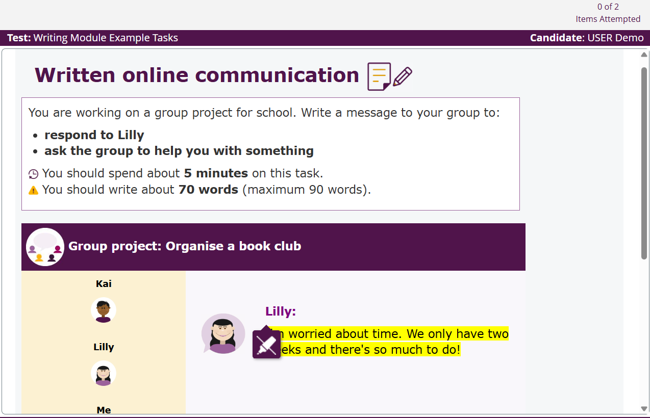 - Highlighting tool: Candidates can select words or sentences in the rubric and questions to apply or remove highlighting. This tool is available in the Listening, Reading and Writing part of the exam.