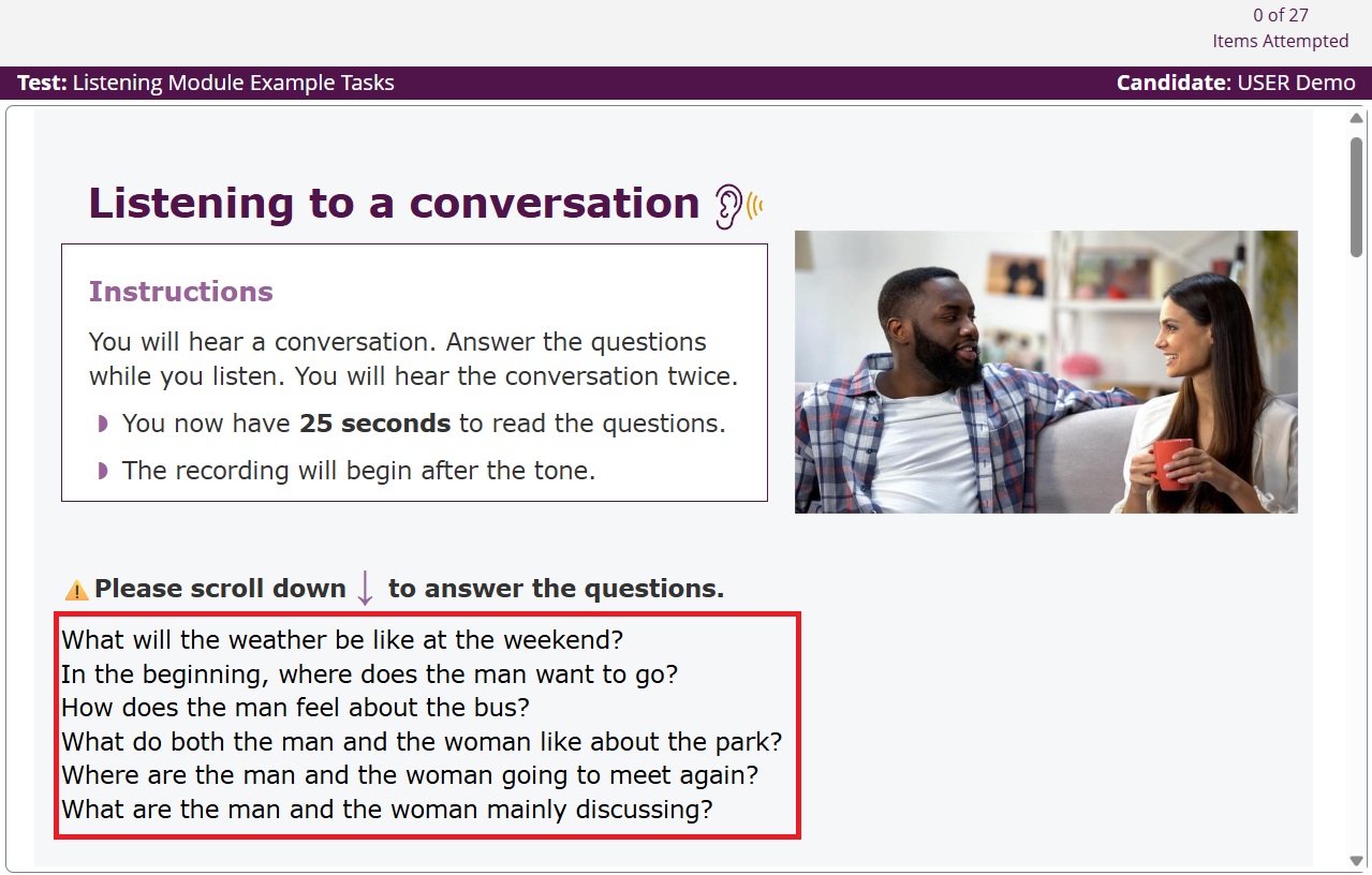 - Question preview: A preview of the questions (without answer options) is displayed below the rubric, enabling candidates to review all questions at a glance without needing to scroll through them individually. This feature is available in the Listening module.